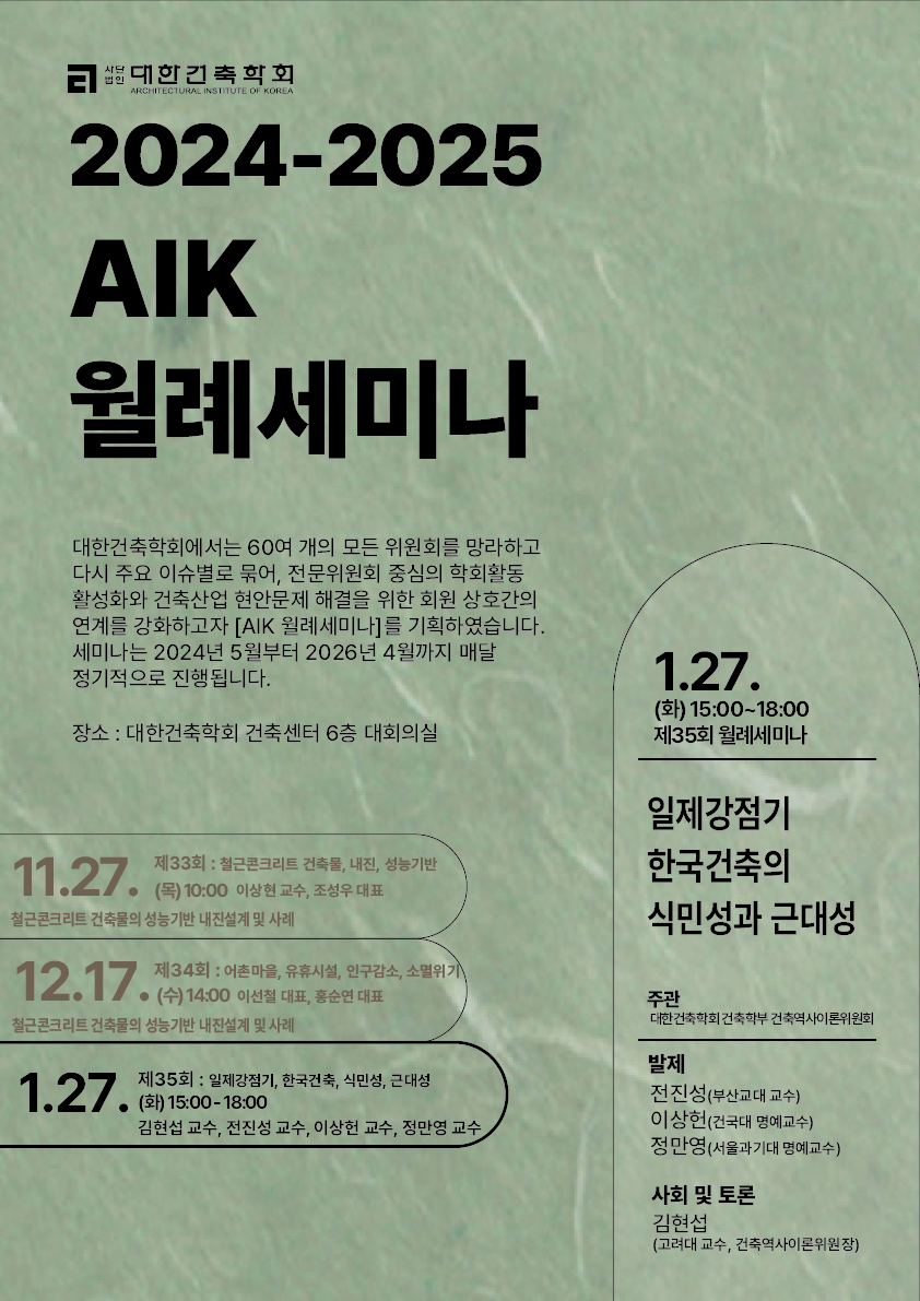 The Architectural Institute of Korea planned the [AIK Monthly Seminar] to encompass all 60 committees and group them by major issues to revitalize professional committee-centered academic activities and strengthen connections among members to resolve pending issues in the architectural industry. Seminars will be held regularly every month from May 2024 to April 5.