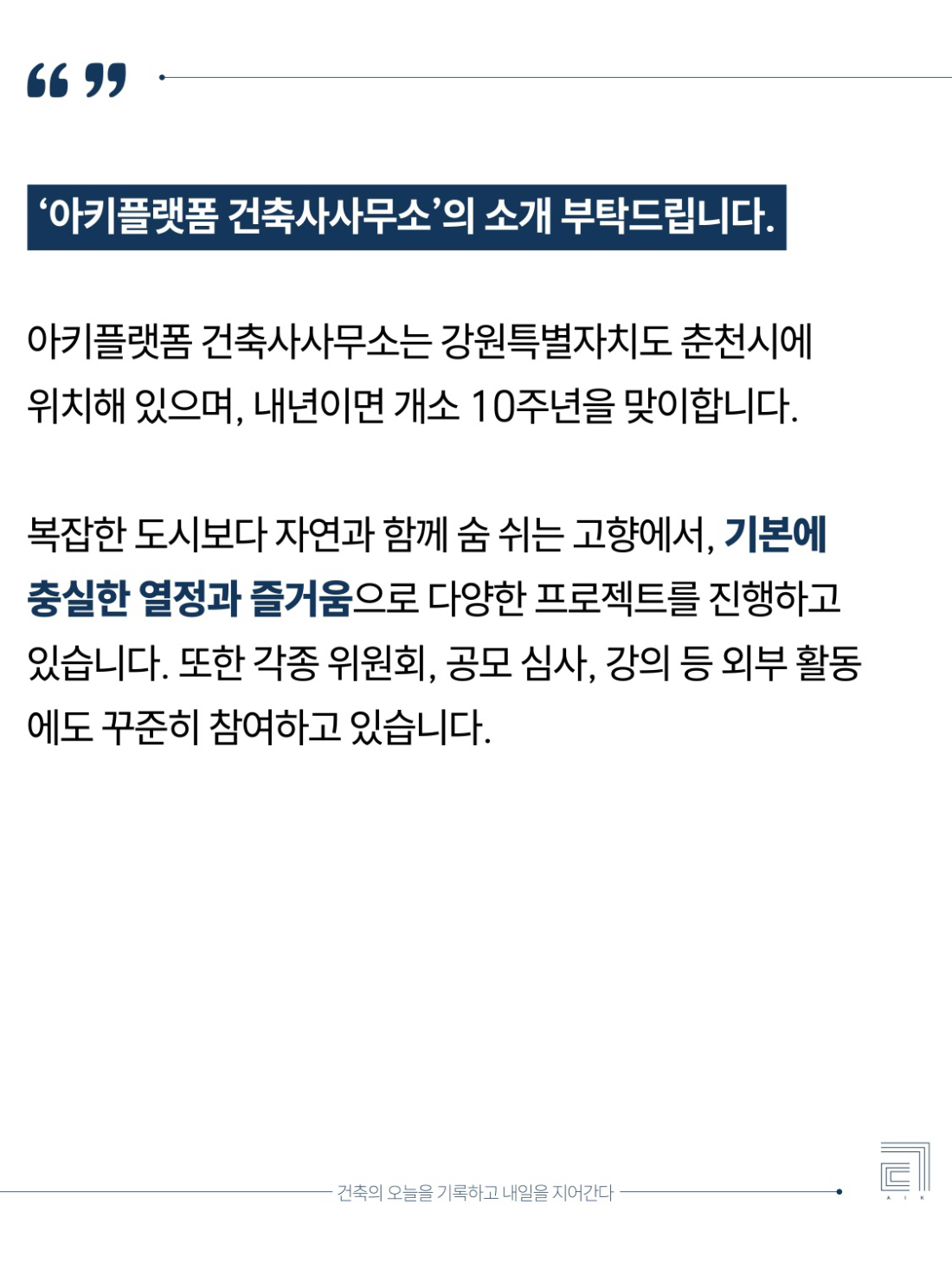 👉';Aki Platform Architects Office'; is located in Chuncheon, Gangwon Special Self-Governing Province, and will celebrate its 10th anniversary next year.