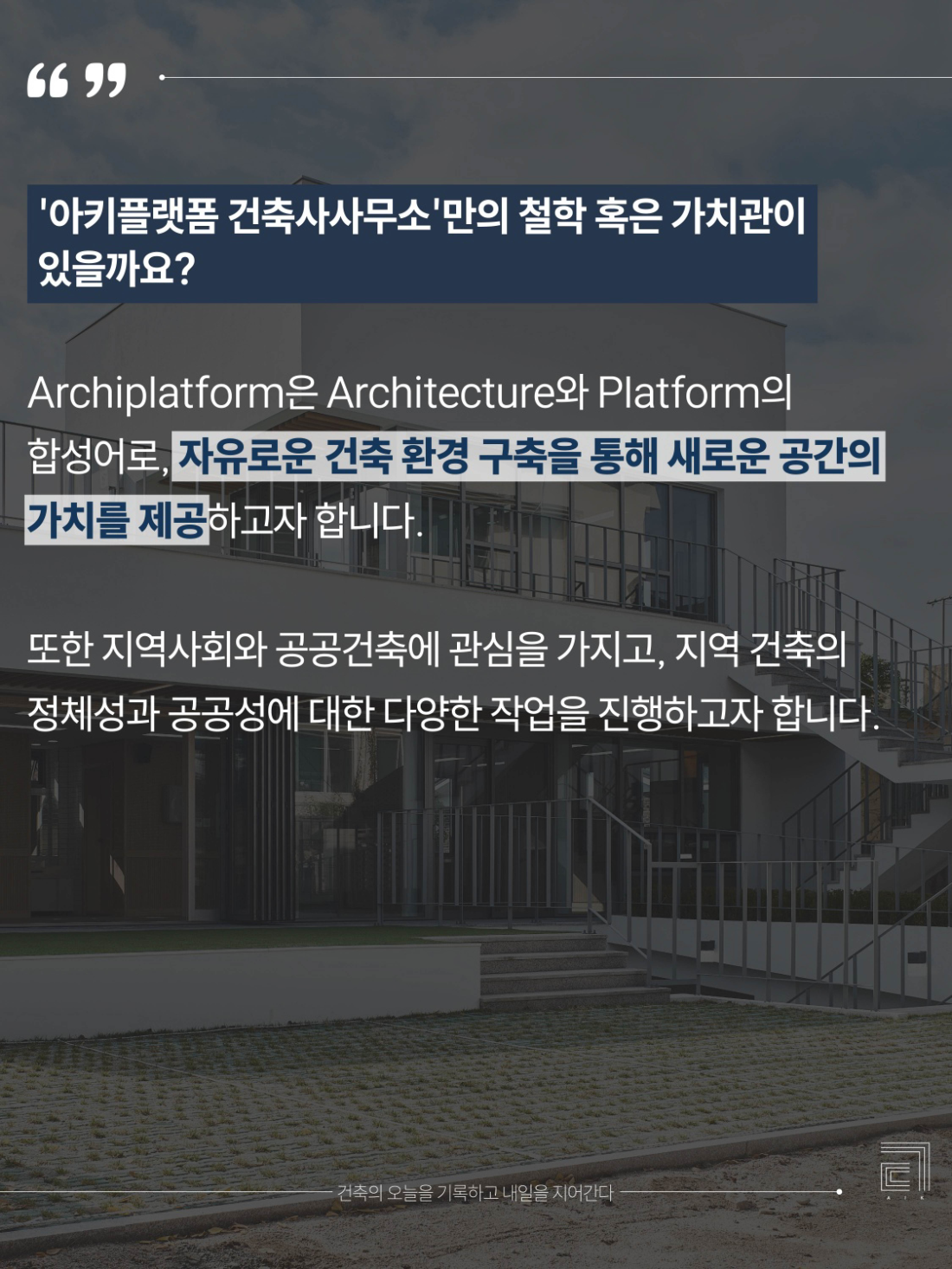 👉 Archiplatform is a compound word of Architecture and Platform, and aims to provide new spatial value by building a free architectural environment.