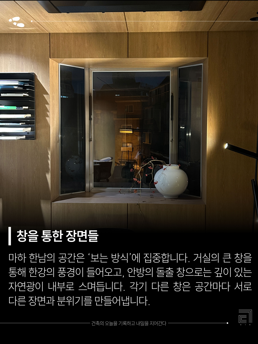 💡Maha Hannam's spaces focus on "ways of seeing." The living room's large windows offer views of the Han River, while the master bedroom's bay window floods the interior with deep natural light. Each window creates a distinct scene and atmosphere in each space.