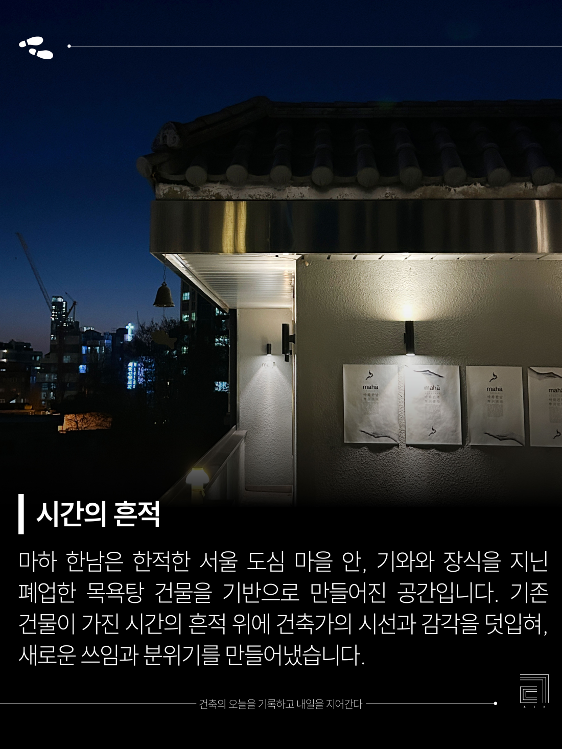 💡Maha Hannam is a space built on the foundations of a former bathhouse, still replete with tiles and ornaments, nestled in a quiet downtown Seoul neighborhood. The architect's vision and sensibility were applied to the original building, creating a new use and atmosphere.