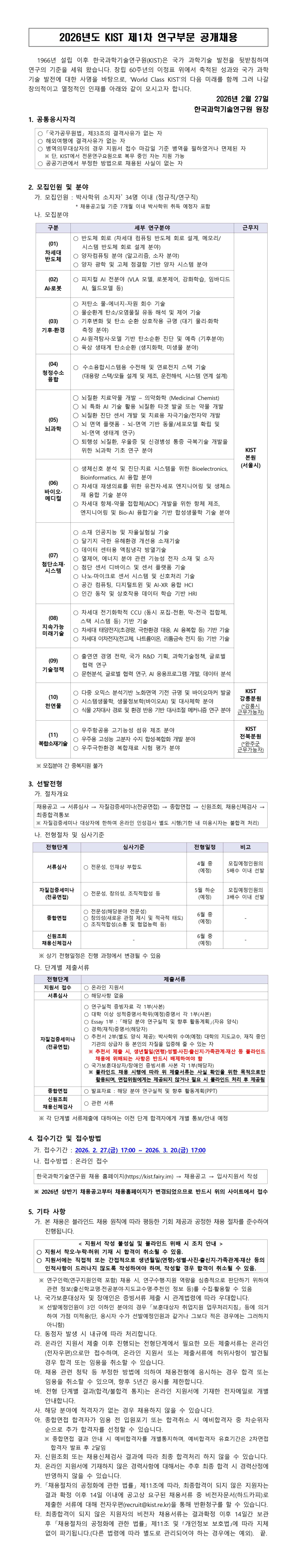 2026 KIST 1rd Research Division Open Recruitment Announcement (~3.20)